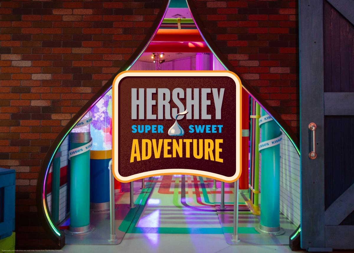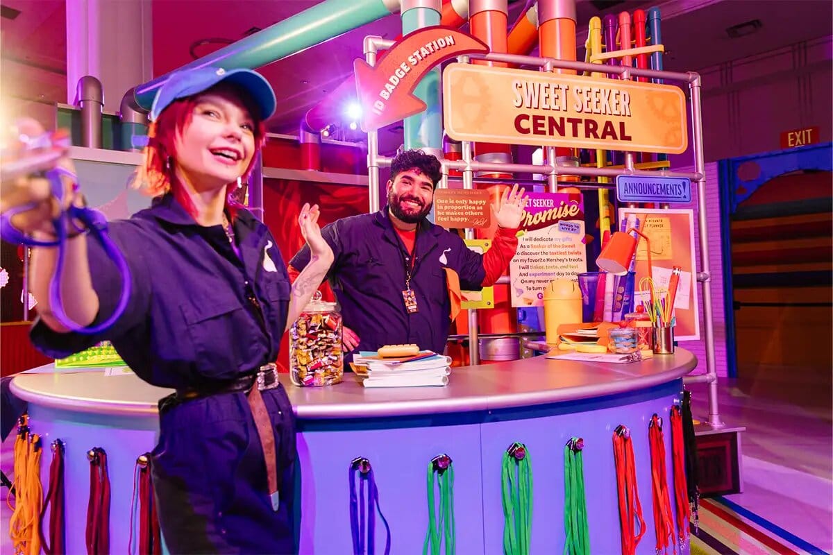 Guests move through a story-based workshop with hands-on zones tied to Hershey brands, including launching âpeanut butterâ balls into oversized REESEâS cups, turning up JOLLY RANCHER flavor with light, color, and sound, designing custom HERSHEYâS KISSES wrappers, and exploring TWIZZLERS maze and spinning elements.