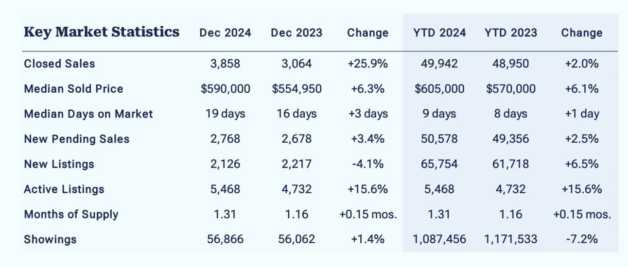 Low inventory: New listings in December hit a historic low of 2,126, a 4.1% drop from the prior year, highlighting limited supply as a key challenge for 2025.