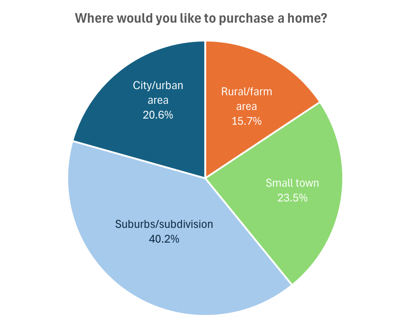 Neighborhood preferences: Suburbs are the top choice for 40.2% of buyers, followed by small towns (23.5%). Proximity to work is key for more than half, with walkability and nearby retail also valued.